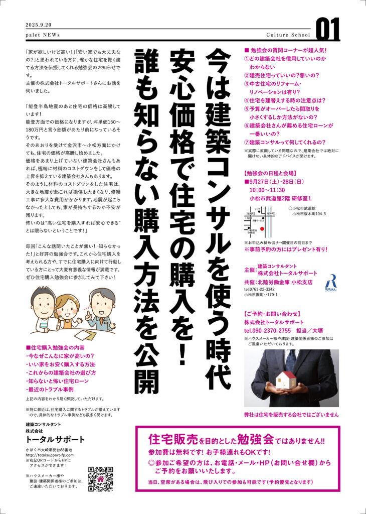 小松市で「住宅購入勉強会」開催します2025.09.17 お知らせ